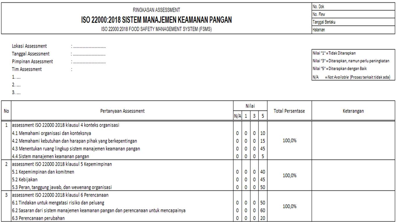 Dokumen Assessment (Penilaian) ISO 22000:2018 Sistem Manajemen Keamanan Pangan (Food Safety Management System) adalah sekumpulan dokumen siap pakai dalam format Microsoft Office Excel yang berisi Pertanyaan dan Penilaian dalam memenuhi Persyaratan ISO 22000:2018 Sistem Manajemen Keamanan Pangan.